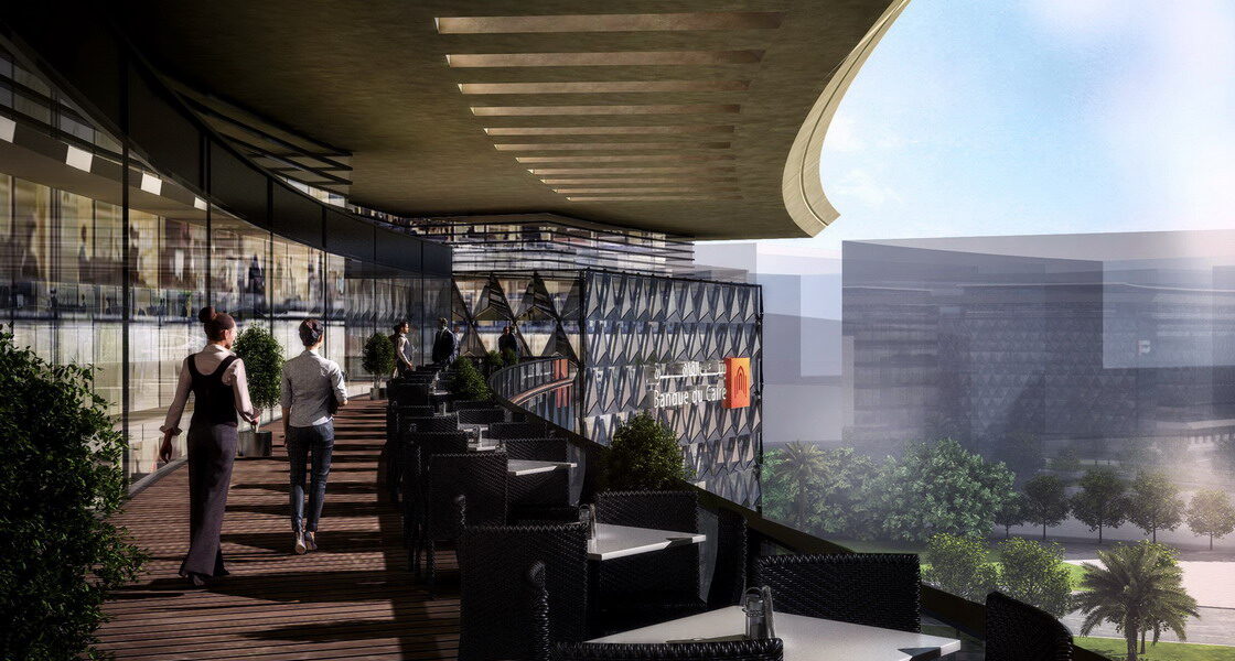 The building includes two underground car parks with an area of 20,906 m2 and a capacity of 350 cars.