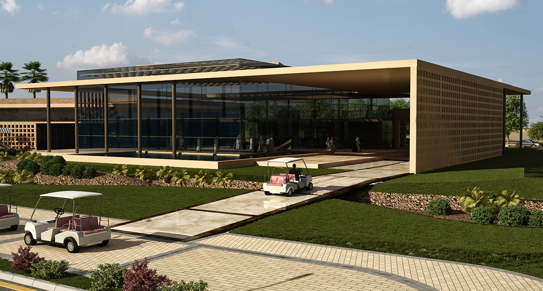 The site layout is designed to include a prestigious entrance approach, green areas, water features, as well as 75 parking spaces and an outdoor parking area for golf carts.