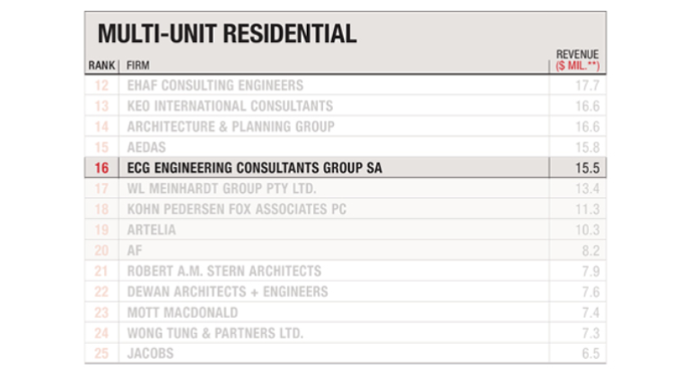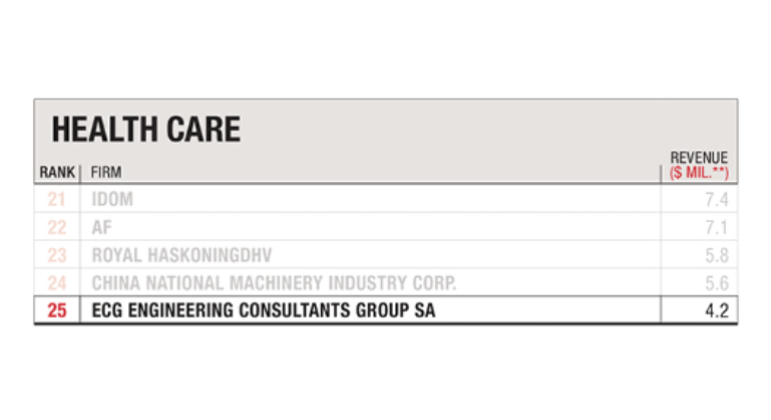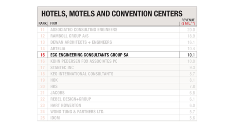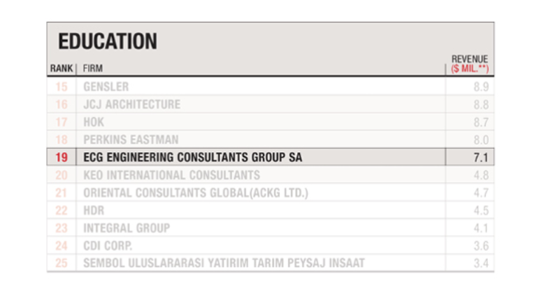 According to the sourcebook, ECG ranks 102nd on the list of “Top 225 International Design Firms.” It also ranks prestigiously within the subcategories of Top International Design Firms as follows: