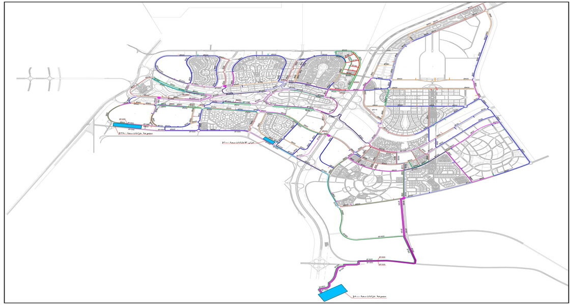 The networks are located under the main streets; feeding the different project areas with the required amount of water through different sources including: