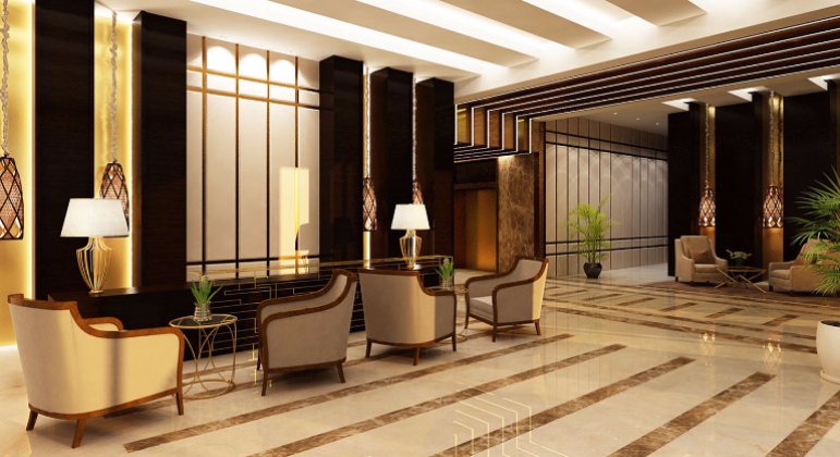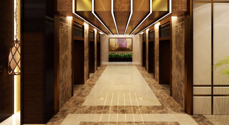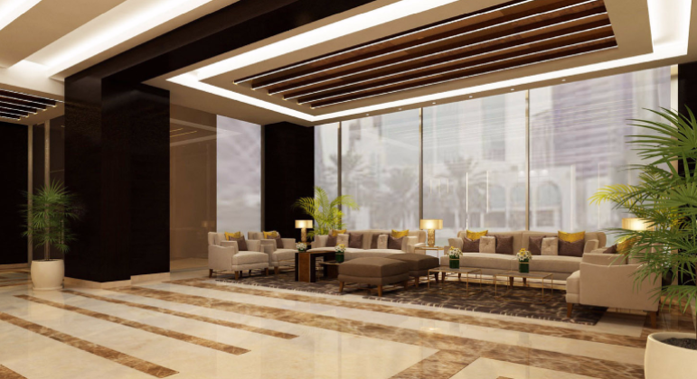The building comprises a basement, ground floor, and 25 upper floors, with hotel apartments, administrative offices, meeting rooms, services, as well as a restaurant, lobby, and gym. Hotel apartments include 60 one-bedroom units and 30 three-bedroom units.