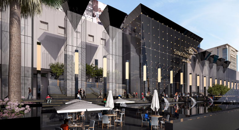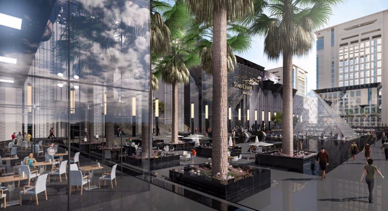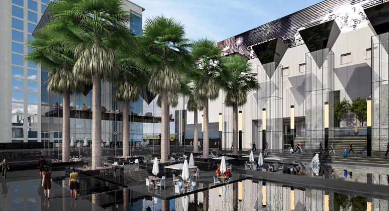 On a land area of 7,500 m2, the project comprises two glass buildings (two restaurants each); a magnificent glass pyramid surrounded by elevated public spaces and outdoor restaurants; and the Boulevard, which is a charming wide passageway between the hotel and the office towers.